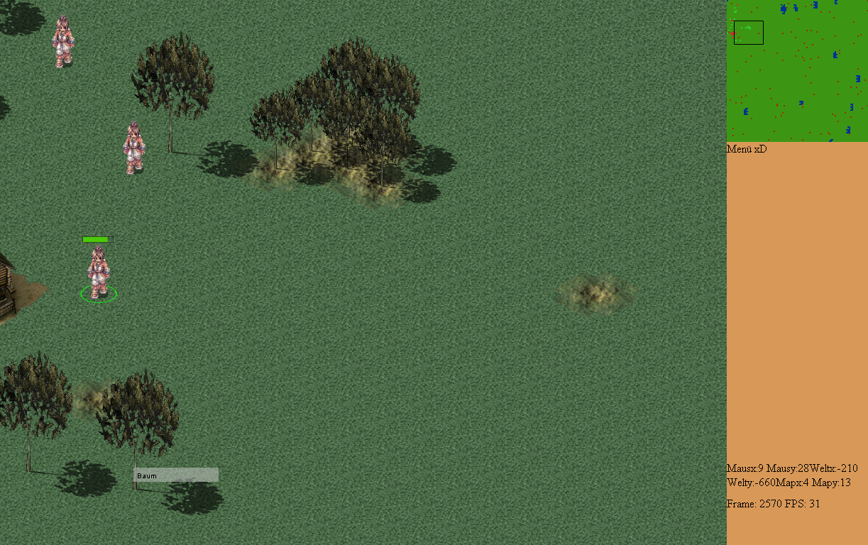 Momentan programmier ich die Bewegung der Einheiten, allerdings gibt es noch keine Kollisonsabfragen bei Objekten und übers Wasser können sie auch noch laufen^^ Es wird allerdings der gelaufene Weg schon Tile für Tile berechnet, wobei die Einheiten sich in 8 Richtungen bewegen können. Momentan tendier ich dazu die Einheiten, wenn ein Objekt oder Wasser im Weg ist, einfach stehn zu lassen. Die Implementierung eines A* würde mich denk ich momentan zu sehr aufhalten und frusten, außerdem ist dieser ja sehr rechenintensiev.