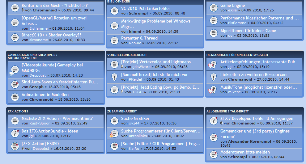 Du glaubst nicht wie lange wir über das blöde Logo diskutiert haben. Das einzige was ich vielleicht ändern würde ist das "Immer in Entwicklung[blank]..." wieder als normalen Text neben die Graphik wie es früher war, statt als teil der Graphik. Die Unterschiedlichen Fonts von ZFX und Developia sind ansonsten beabsichtigt.eXile hat geschrieben:Sorry, aber wir haben nun drei verschiedene Schriftarten und Formatierungen im Header-Bild. Dazu würde ich gerne die Suche nach alternative Ideen anstoßen … natürlich ist das jetzt nichts Weltbewegendes, aber ich wollte es hier doch noch anbringen ;)