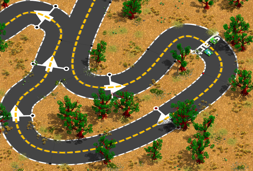 dann hab ich noch tonnenweise alte szenenobjekte wie bäume und steinbrocken aus scaw wieder gefunden und musste das mal mit der strecke kombinieren. allerdings ist das noch photoshop, ich denke es lässt sich aber noch im browser realisieren. das bild ist auf 50% runterskaliert worden. die rennstrecke ist svg und der rest sind png bilder. die querbalken represäntieren das was ich mir als checkpoints vorstelle.