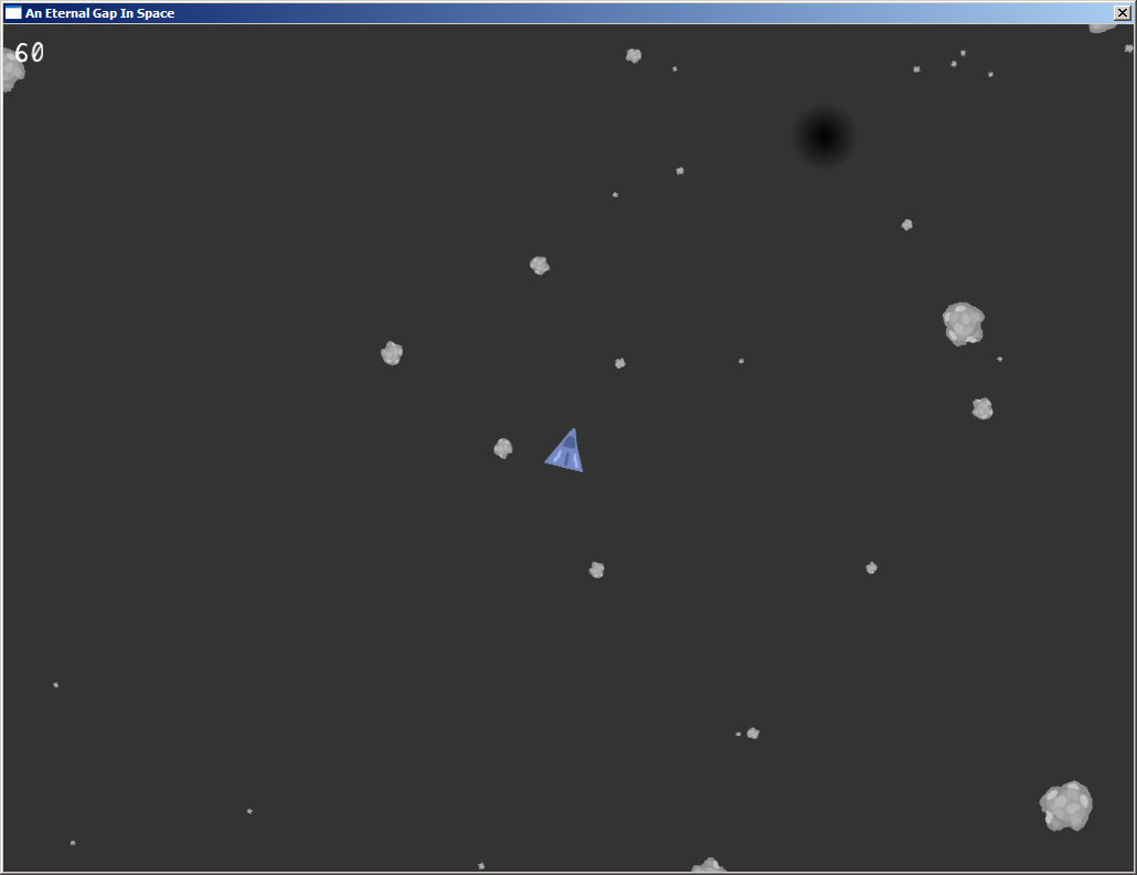 Ich schaff das inzwischen übrigens recht regelmäßig, einen Brocken abzuwerfen. Man kann halt nicht aus dem Inneren schmeißen - das wird dann ein reines Glücksspiel durch die ganzen Kollisionen, außer der Brocken ist wirklich schwer und rammt einfach alles beiseite :-) Die blauen Brocken, die nur ganz in der Mitte vorkommen, haben dreifache Dichte, die lassen sich von Kollisionen kaum noch beeindrucken. Für alle anderen flieg ich rein, angel mir einen, lasse mich mit ihm an der Angel um das Loch rumschwingen und beschleunige nach außen. Kurz vor 270° der Umrundung dann mit Rotieren anfangen, Rückwärtsschub grob in Richtung des Sammelplatzes und loslassen, wenn der Brocken gerade in Richtung des Pfeils schwingt. And off he goes. Ist aber knifflig, und fühlt sich zugegebenermaßen alles recht träge an. Das war zwar Absicht, die von Osmos inspiriert wurde, scheint aber nicht so gut anzukommen.