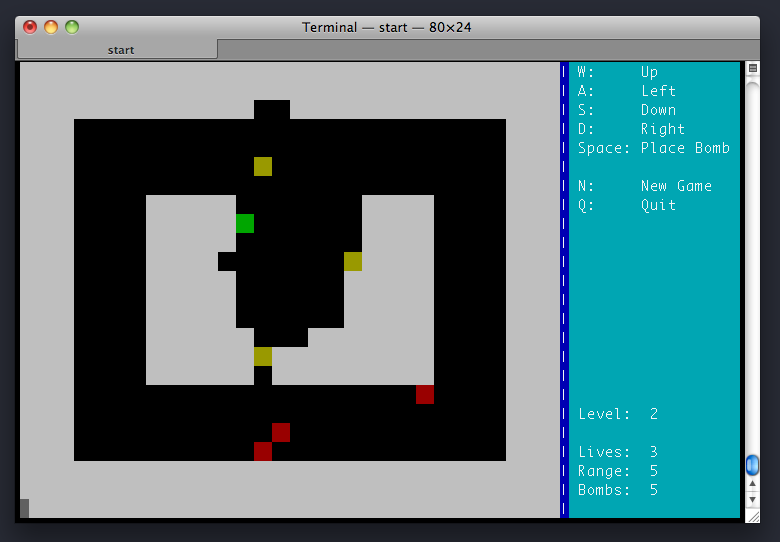 Herausgekommen dabei ist ein kleines Spiel in highend Terminal Grafik :D Im Grunde ist es einfach ein Bomberman Clon. Hat aber sehr viel Spass gemacht mal so schnelle Fortschritte zu sehen. Wer mag kann es sich gerne mal laden und ausprobieren. Aber bitte nicht so genau in den Code gucken. Es ist 4 Uhr und dem entsprechend sieht der Code aus :D