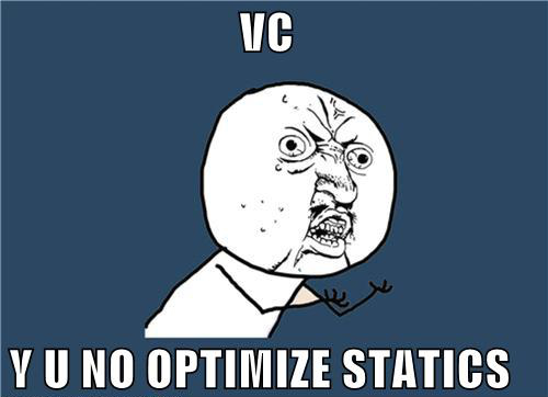 Seit dieser K’tor 107 Mal mit einem String-Literal als Parameter aufgerufen wird, braucht LTCG nicht mehr drei Sekunden sondern 24. Und dabei kriegt dieser Drecks-Optimizer das ja noch nicht einmal aufgelöst, da er 64-Bit-Shifts nicht statisch auswerten kann. Echt mal, wtf Nehme ich zurück! Er schreibt tatsächlich zweimal mov. Vor ein paar Tagen sah das noch anders aus, da musste ich ja auf zwei 32-Bit-Wörter ausweichen, damit er es optimieren konnte. Für die Berechnung von 1100 64-Bit-Shifts ints 21 Sekunden zu brauchen ist aber trotzdem nicht, was ich von einem Optimizer erwarte.