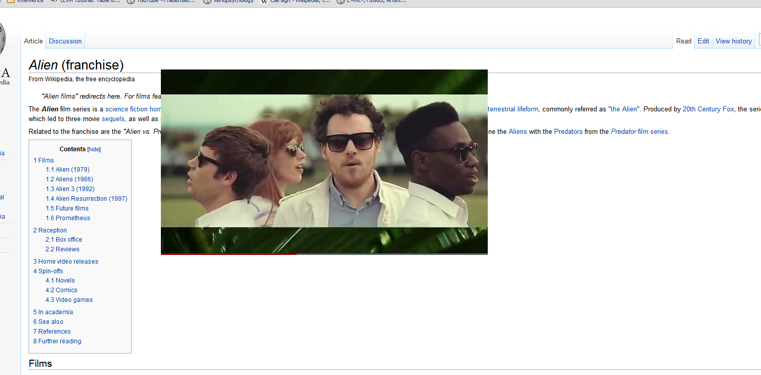 Dies ist ein YouTube-Video, das aus einem Fenster hinter dem mit der Wikipedia durchscheint, aus einem Tab, das in jenem Hintergrundfenster im Hintergrund ist. Es sollte also aus zwei Gründen unsichtbar sein. Stattdessen plöppt es beim Surfen einfach so auf.