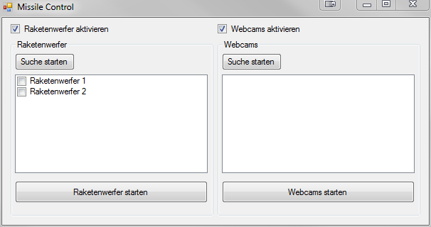 Ich hab momentan den Plan, dass MissileControl aus zwei Fenstern besteht, einmal das Hauptfenster, in dem man die Raketenwerfer und die Webcams getrennt in Listen angezeigt bekommt und die Geräte einzeln aktivieren und deaktivieren kann. Wenn die Raketenwerfer gestartet werden, wird deren Auswahlfenster deaktiviert und die Form empfängt die Tastatursignale, um die Raketenwerfer zu steuern. Wenn die Webcams gestartet werden, wird ein zweites Fenster geöffnet, in dem man ein großes Bild hat, in dem man das Bild der ersten Webcam in der Liste sehen kann. Oben sieht man für alle aktivierten Webcams ein kleines Vorschaubild, welches ebenfalls Live-Bilder anzeigt, nur halt in klein. Wenn man auf eines der Vorschaubilder klickt, bekommt das große Bild von dann an das Bild der Webcam, zu dem das Vorschaubild gehörte.