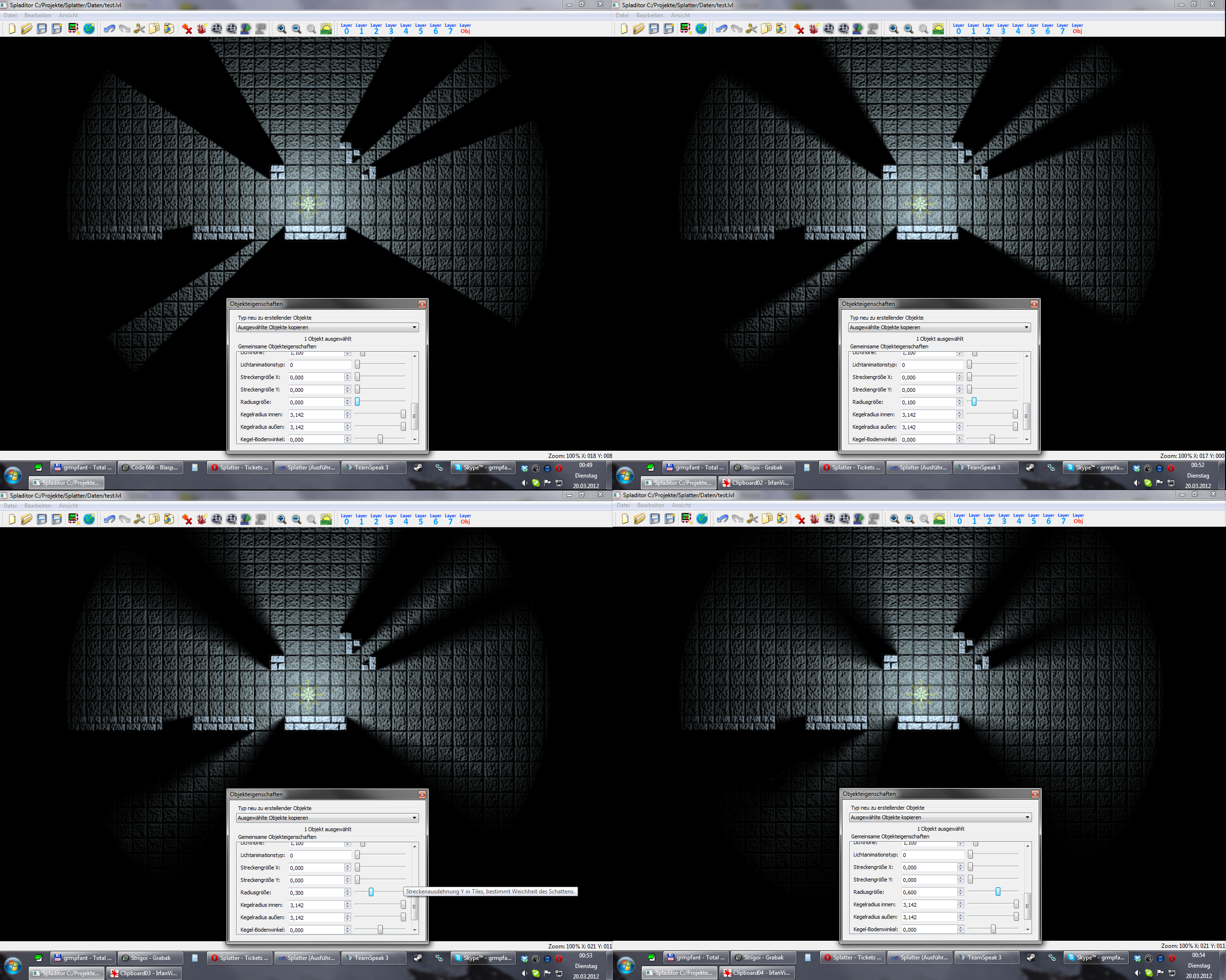 Zur Erklärung: links oben Lichtquelle mit 0,0 Tiles Radius, rechts oben 0,1 Tile Radius, links unten 0,3 Tiles Radius, rechts unten 0,6 Tiles Radius. Das entspricht bei 1280x1024 einem Lichtquellenvolumen von 80 Bildschirmpixeln Durchmesser. Zu schade, dass die 3D-Welt nicht ganz so einfach ist. Und ebenso schade, dass diese Penumbra Areas in bestimmten Konstellationen dann doch nicht so schön konsistent sind. Trotzdem ein gewaltiger Fortschritt. Ich freu mich gerade wie ein Schneemann im Frostfach.
