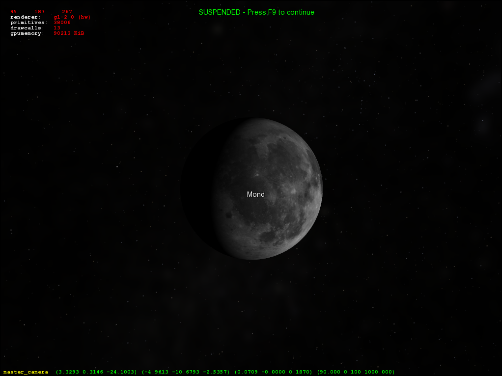 • 50 MiB Texturdaten (Albedo und Normalen beim Mond, allerdings nicht in dieser Demo, um Bandbreite zu sparen) sind auch heute noch ziemlich viel; erst recht für einen letztendlich meist 15×15 Pixel kleinen Punkt.