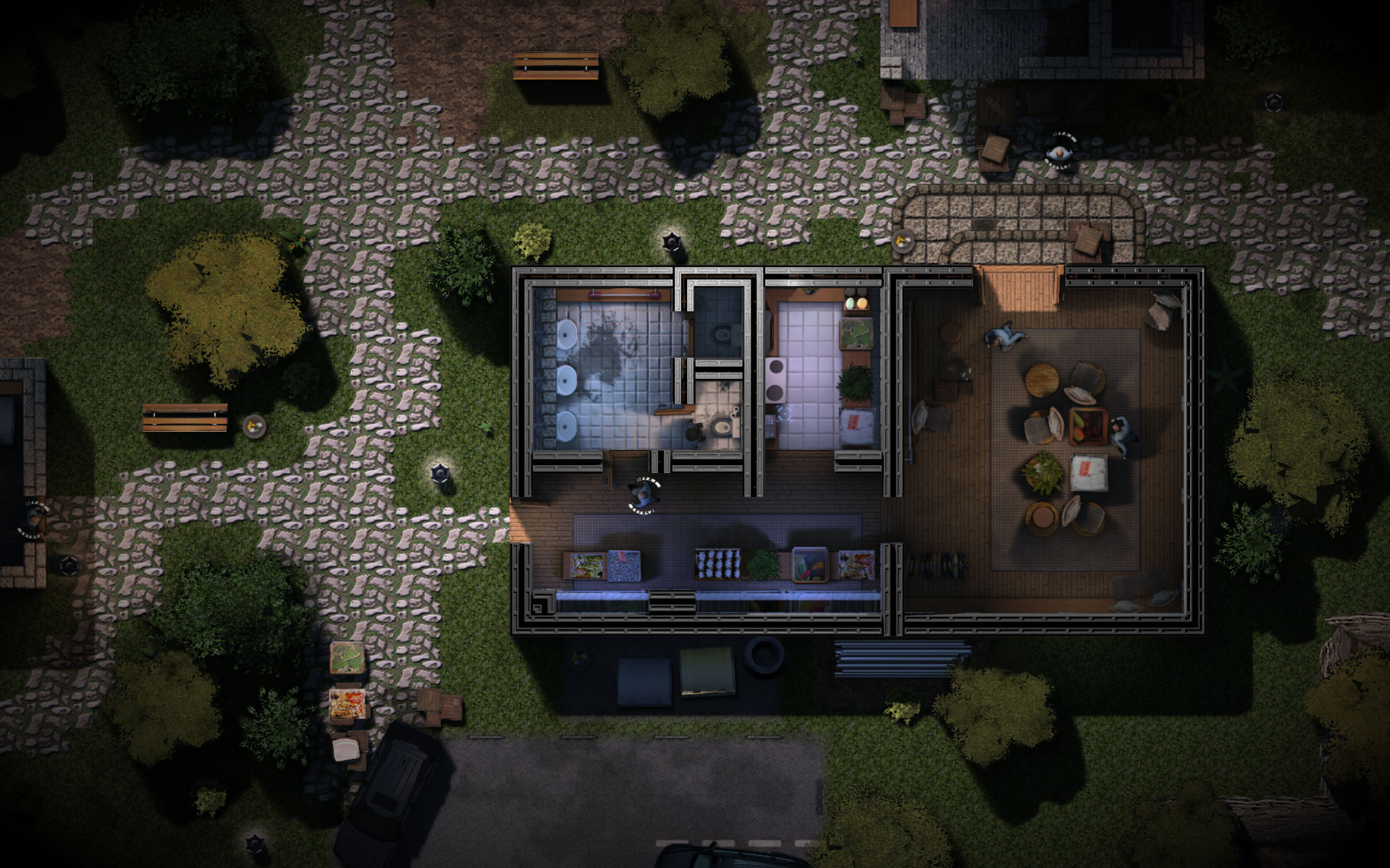 Mir fällt nur die Textur-Kachelung negativ auf bzw. manchmal eine gewisse Leere und Eintönigkeit. Könnt ihr nicht irgendwie noch eine Art von groben, geblurten Noise drübermachen oder verschiedene Farbtöne (z.B. Grün-Tönen der Wiese) zufällig setzen? Oder Grasbüchel/Blumen/Decals etc. Das würde ein wenig die Strenge und Sterilität nehmen.