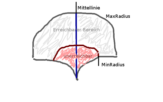 Während des Tippens kam mir der Gedanke, wie das aussehen könnte. Der erreichbare Bereich der Tentakelspitze relativ zum Fußpunkt müsste wie folgt aussehen: