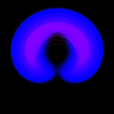 Von oben nach unten: 0.4 Radian Winkelgrenze, dann 0.5 Radian, dann 0.6 und schlussendlich 0.7 Radian. Der weiße Punkt in der Mitte ist die Startposition des Roboterarms mit Startrichtung hoch, Blau ist der vom Arm-Endpunkt erreichbare Bereich, die Rotabstufungen sind die Positionen der Zwischensegmente. Bei 0.4 Radian habe ich fast keinen Bewegungsspielraum, bei 0.6 Radian kann sich das Tierchen zumindest schon selbst auf die Schulter klopfen, ab 0.7 Radian kann es sich außerdem am eigenen Tentakel kratzen. Mein Bauchgefühl meint, ich komme der Lösung langsam näher.