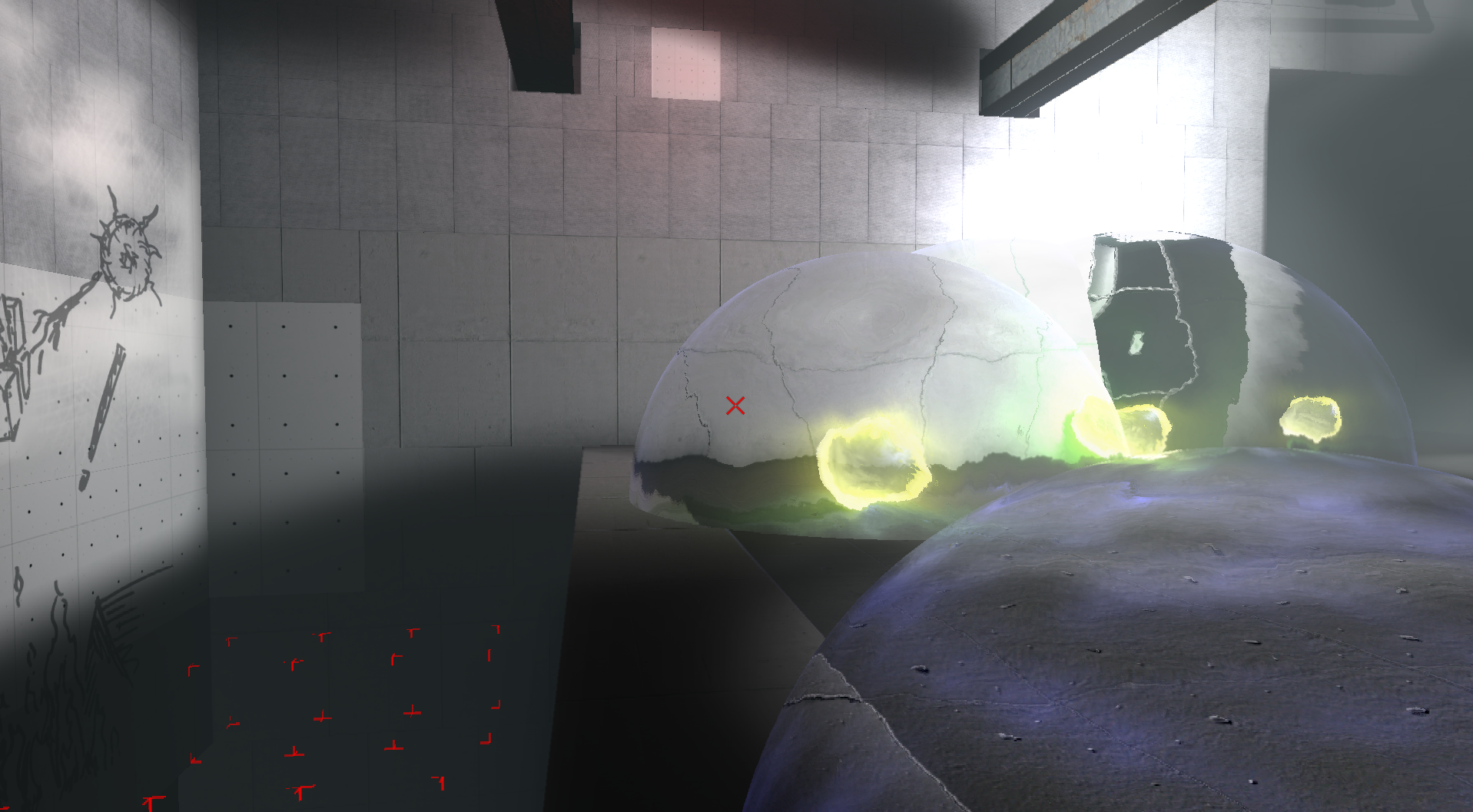 Wir nutzen einen Deferred Renderer mit Full-HDR und einem grossen Haufen Trickserei um komplexe Brechungs- und Raumverzerrungseffekte darstellen zu koennen. Nachdem wir auf der XBox leider nicht ganz auf 720p rendern koennen, machen wir es wie Crysis 2 (und die UnrealEngine auch) und rendern HUD + Menue auf 720p und die Szene auf geringerer Aufloesung. Diese skalieren wir dann hoch, wobei wir auch noch einen leichten Kantenglaetter drueberlaufen lassen.