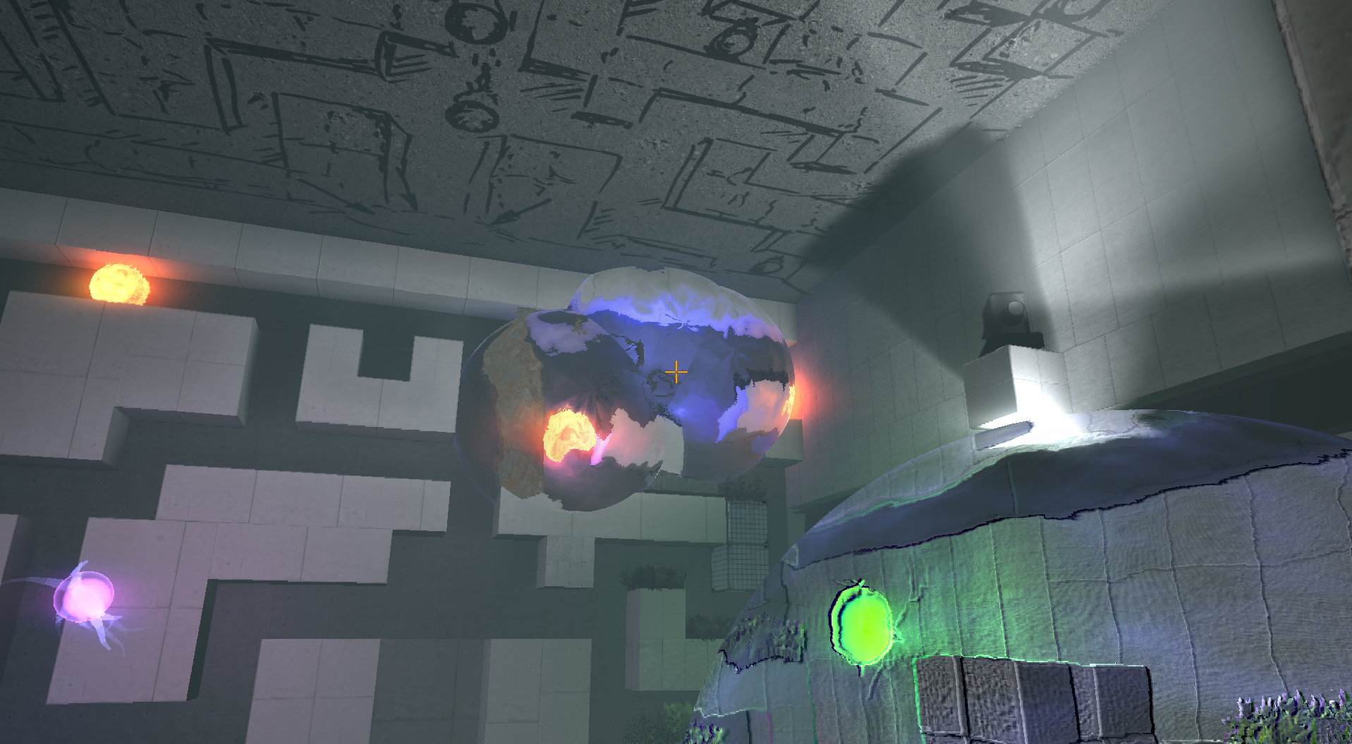 Als nuetzliches Hilfsmittel gibt es die Moeglichkeit, Gravitationsfelder zu erschaffen, die alles bewegliche in Reichweite zu einem bestimmten Punkt hin ziehen. Zuweilen laesst sich auch der gesamte Raum kippen, was, wie im Trailer zu sehen, allerdings auch nicht unbedingt ungefaehrlich ist.