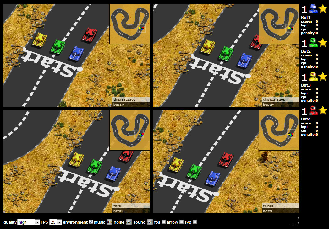 das auswahl gui nimmt langsam endform an. gui programmierung in javascript ist ganz schön mühsam, vor allem da ich alles eigene elemente gebaut habe. das komplette gui lässt sich sowohl mit maus wie auch nur mit der tastatur bedienen. da mir irgendwann das programmieren etwas über war, habe ich noch zusätzliche fahrzeuge eingebaut. inzwischen ist das gui auch wirklich ein einstiegspunkt für das spiel, d.h. die einstellungen werden übernommen. ein wichtiger punkt der diesbezüglich aber noch umgesetzt werden muss, ist die strecken/meisterschaftsauswahl. hab eben noch am entsprechendem gui element rumgebastelt, das verhalten ist jetzt so wie ich es mir vorstelle. 4 player splitsceen ist jetzt auch schöner, wird aber eh keiner brauchen :(