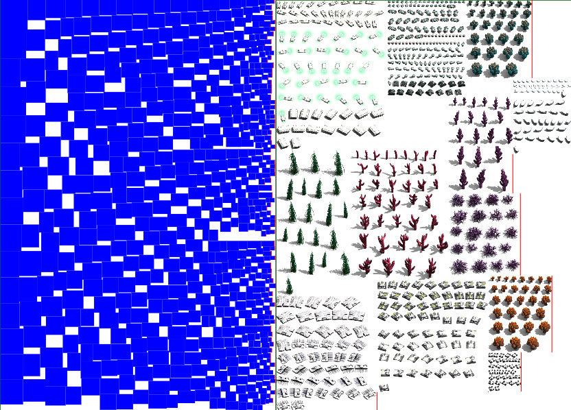 die variante mit bildern habe ich zuerst erstellt, hier werden die sprite-sheets direkt mit dem neuen algo in ein grösseres bild gepackt. nachdem das ganz gut funktionierte, dacht ich mir ich schau mal was der neue algo macht, wenn ich aus den alten sprite-sheets alle bilder raushole, das ergebnis ist das blaue bild. ist noch ein bisschen besser gepackt.