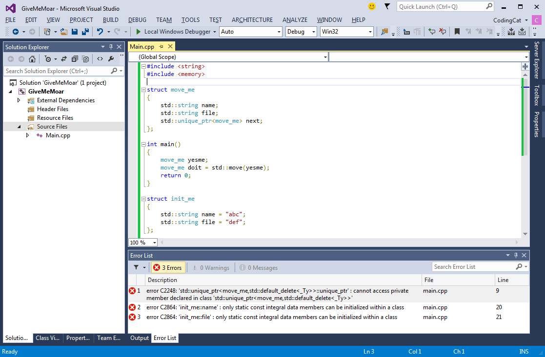 Kurz darauf erwähnt Herb Sutter ganz beiläufig, dass = default NOCH NICHT FÜR MOVE-FUNKTIONEN funktioniert, bis das CTP rauskommt. Dabei bräuchte man dafür nicht mal noexcept. Fazit: Zurück in die Steinzeit mit VC 2013 RTM.CodingCat hat geschrieben:VC 2013 RTM soll tatsächlich inline non-static data member initialization und = default beinhalten. Damit betreten wir mit C++11 endlich eine neue Ära, in der sich zusammengesetzte Datentypen sinnvoll definieren und in Arrays/vectors verwenden lassen. Automatisch definierte Move-Konstruktoren und -Zuweisungen bekommen wir wohl noch nicht, weil dafür erst stringent noexcept implementiert werden müsste, aber immerhin ertrinken wir nicht mehr in sinnloser Redundanz.