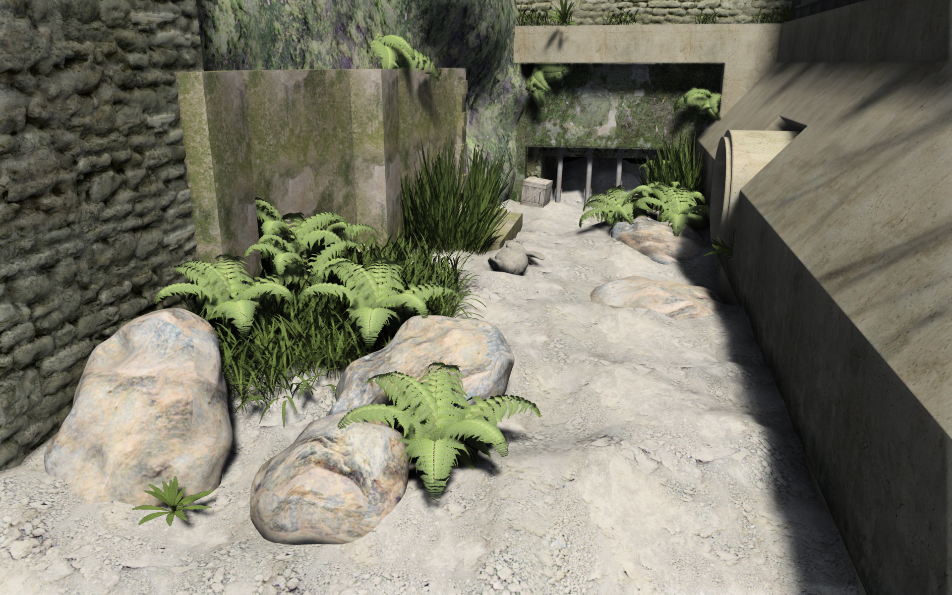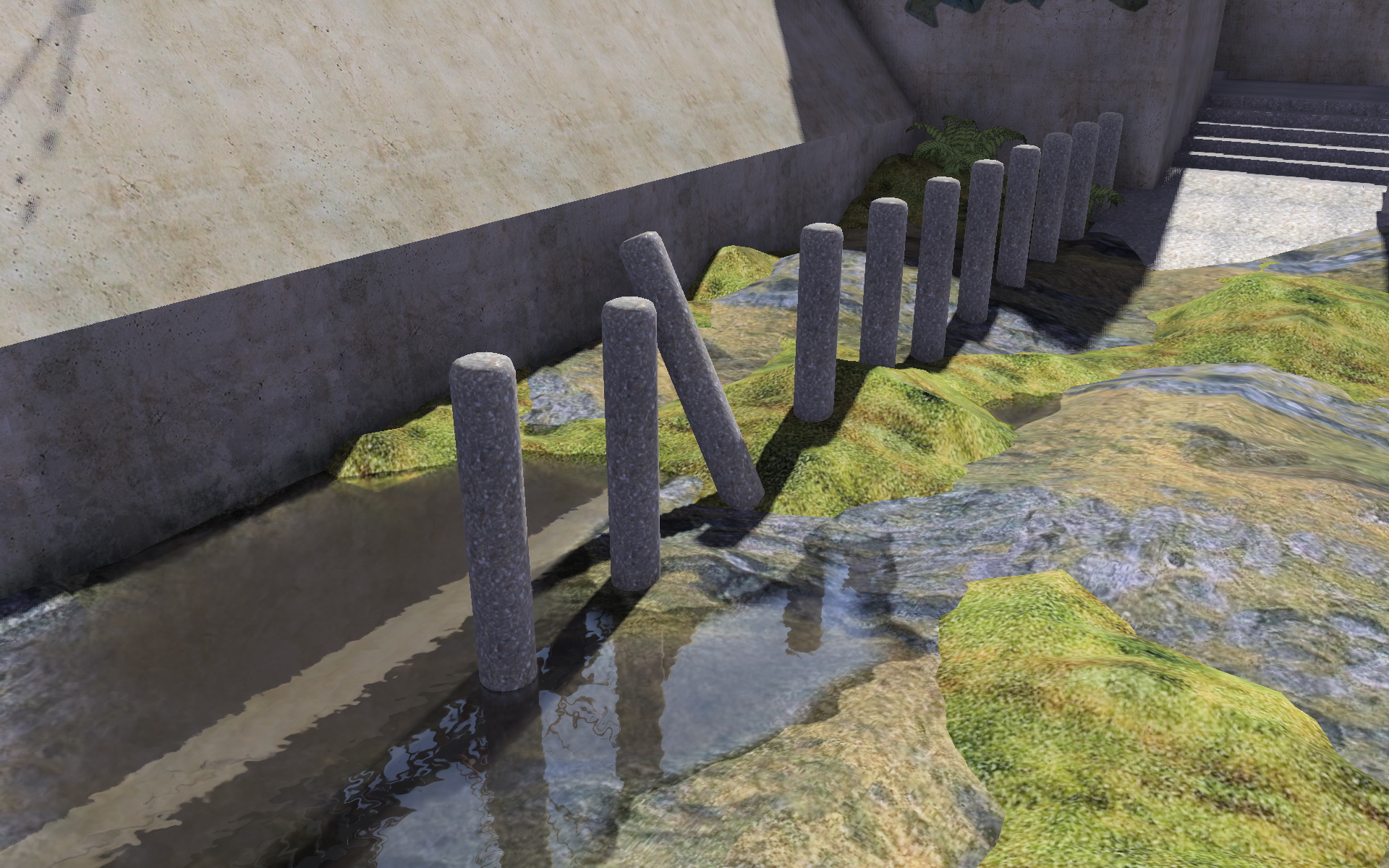 bilder sind super... vielleicht könntest du mal einen wassershader machen, der einen ölfilm auf der wasseroberfläche simuliert, das würde in die szene passen ^^... für die übergänge von algen/moos und normalem stein könntest du vielleicht zumindest an den rändern eine art fur effekt oder so basteln.... ein mesh mit einer fransigen moostextur reicht da vielleicht schon... da du ja viel wert auf prozeduraler generierung legst, könntest du einen generator schreiben, der bei schnittkanten bestimmter meshes ein übergangsmesh baut...