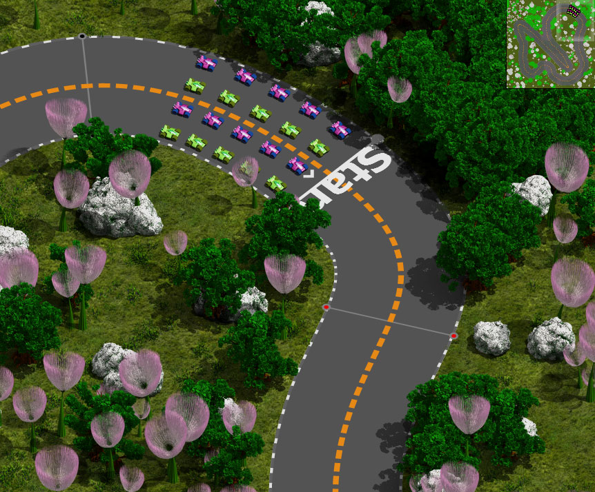 aktuell bin ich mal wieder an der KI. die neuen features die die KI miteinbeziehen muss sind extras (noch ohne ausführung) und speed-ups. desweiteren ist mir aufgefallen wie oft die fahrzeuge an bäumen feststecken, was ich versuche zu verbessern. um das verhalten zu verbessern habe ich jetzt überall auf der strecke selbst hindernisse eingebaut, nur schön auf der strecke bleiben verhindert nicht, dass ein konflikt entstehen kann. die hübschen magenta-objekte sorgen jetzt für neuen schwung in der kolonie.