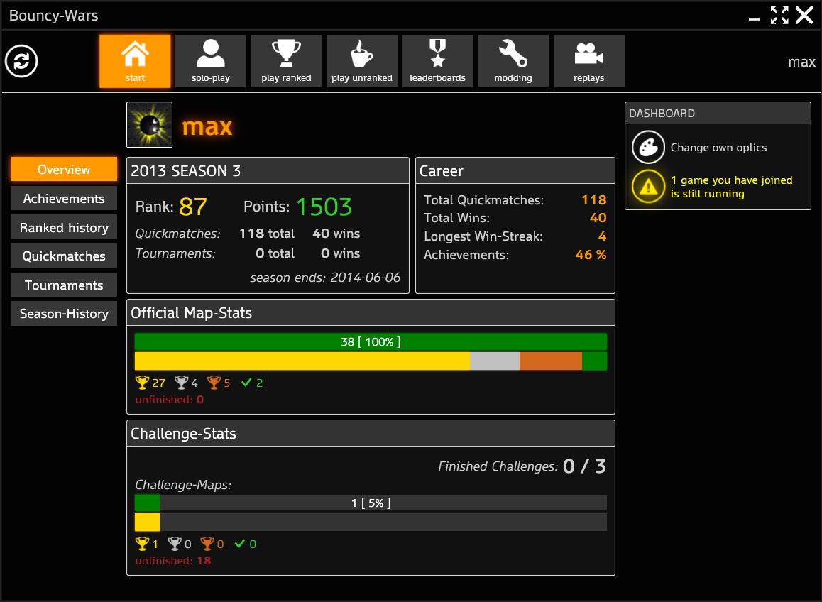 Der Name des Spiels ist Bouncy-Wars und es handelt sich um ein Shoot em' up aus der Vogelperspektive. Es geht darum einen meist bewaffneten Flummi möglichst schnell durch unterschiedliche Maps zu bewegen, während man auf die gegnerischen Flummis schießt, sich an Wänden abprallen lässt und versucht die beste Strategie zu finden, um eine neue Best-Zeit zu erzielen. Das spezielle daran ist, dass es sich um ein reines Online-Game handelt, welches einen ähnliches Ansatz wie Starcraft 2 verfolgt. Sprich jeder Spieler hat ein Profil, dass zentral auf dem Bouncy-Wars Server abgelegt ist. Es gibt unterschiedliche Spielmodi, die sich in Unranked und Ranked unterteilen lassen, die in den nächsten Absätzen beschrieben werden. Das Spiel hat heute keine Kampagne oder Story, sondern ist in erster Linie auf den Wettstreit unter den Spielern ausgelegt. Falls das Spiel Anklang finden sollte, ist eine Kampagne mit Story angedacht.
