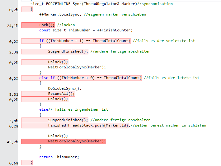 Wenn man es einstellt, dass die die Synchonisationsfunktionen überrepräsentiert sind (also sehr kleine Arbeitspakete nach jedem wird synchonisiert) dann zeigt der Profiler wo der Preis für die Synchonisation gezahlt wird :(