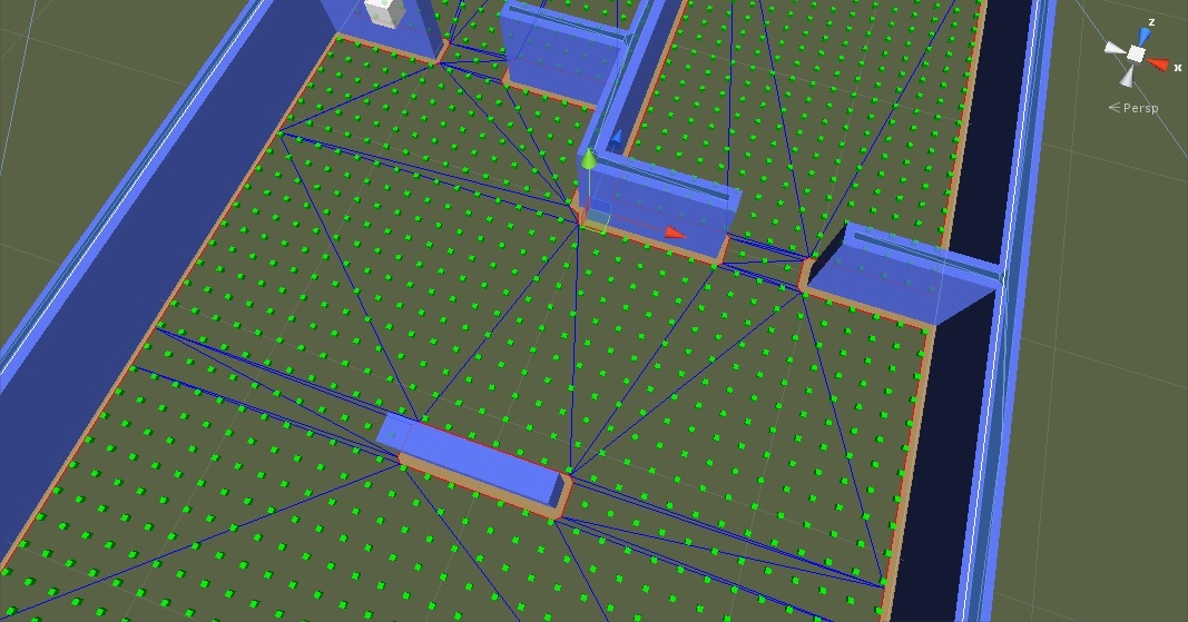 Nachdem das Unity/Recast-Detour Navmesh für meine analytischen Zwecke zu undetailliert war (um genauer zu sein zu ungleichmässig trianguliert), habe ich nun noch einen Grid-basierten Suchraum implementiert. Hier werden die originalen UnityNavmeshdreiecke im regelmässigen XZ-Abstand gesampelt und anschliessend die Verbindungen berechnet. Dabei ist mir aufgefallen, dass das Raycasten auf dem Unitynavmesh fehlerhaft implementiert ist und -an Stellen, wo sich das Navmesh überlappt- nicht funktioniert (man kann von einem oberen Layer in den unteren erfolgreich Raycasten). Vermutlich ist das schon in der original Recast/Detour Implementierung drin und könnte somit auch für andere Engines gelten, die es integriert haben (z.B. Unreal 4 Engine).