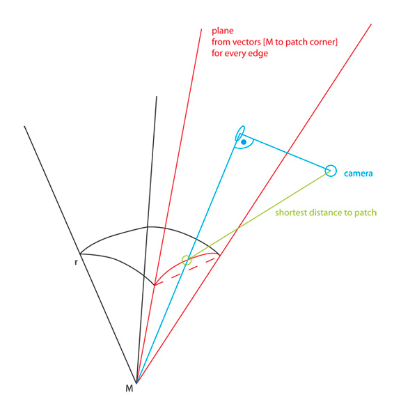 Ein Ansatz wäre daher evtl.: vom Mittelpunkt aus Ebenen entlang der Kanten eines Patches aufspannen. Wenn die Kamera innerhalb des aufgespannten Volumes ist, ist die Lösung trivial (shortestDistanceToPatch=distanceToCenter - r). Wenn die Kamera außerhalb ist, Fallunterscheidungen wie beim Polygontest, den Punkt aber auf die Kugeloberfläche projizieren statt auf das Patch-Polygon.