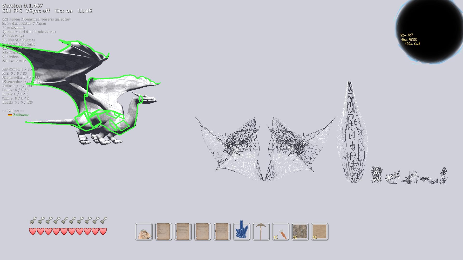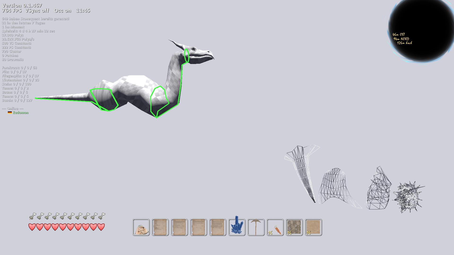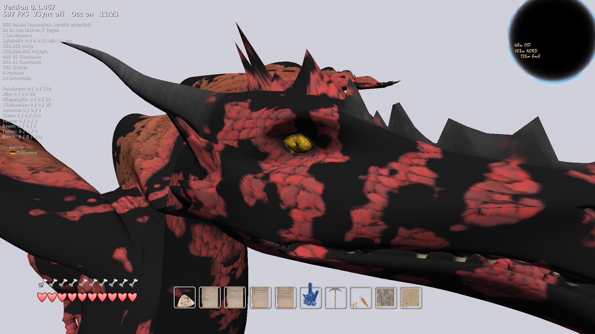 Ich will dann als nächstes mal schauen, dass der Drache auch mal rumlaufen kann... und zwischendurch wäre es schon sehr sinnvoll, den shader dann mal in eine Textur zu backen, damit der Pixelshader nicht ganz so sehr auf die Performance geht.