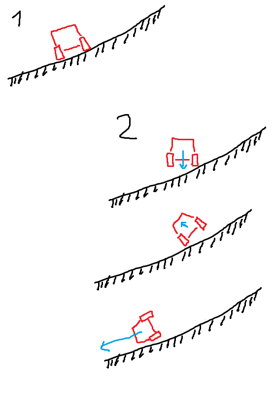 „So sanft wie möglich“ bedeutet nicht, was du dir vorstellst (Fall 1 im Bild), sondern, dass mindestens ein Reifen den Boden berührt. Bei einem Hang sind die anderen Reifen aber wahrscheinlich noch immer über dem Boden und fallen, während die Reifen mit Bodenkontakt ihre Federstärke als Drehmoment übertragen, und dann kullert das Ding runter (Fall 2):Die sanftmöglichste Orientierung will ich ja eben ausrechnen.Alexander Kornrumpf hat geschrieben:Ja schon richtig. Aber ich glaube nicht, dass das wirklich das Problem ist. Als allererstes ist es mMn eine Frage des Leveldesigns. Ich kenne kein Level und keine Physik-Engine wo du ein Auto ohne Probleme an jedem Punkt spawnen kannst. Eine gewisse Kontinuität muss die Landschaft schon haben. Zweitens ist ein Auto nichts was sich dazu anbietet einen Überschlag zu machen [meine Physikkenntnisse reichen nicht aus um das besser zu beschreiben]. Ich vermute die Dinger werden mit Absicht so konstruiert, dass sie sich nicht ständig überschagen. Sondern das Bild, dass wir jetzt hoffentlich beide vor Augen haben entsteht, weil Numerik auf einem Digitalrechner ein Problem ist. Ein echtes Auto in der echten Welt würde ein einer sehr großen Reihe von Szenarien meinem Verständnis nach einfach stabil landen.Die Handbremse funktioniert aber nur, so lange das Auto bereits ausbalanciert ist. Wenn die Räder nicht den Boden berühren, weil das Auto vom Boden abprallt, bringt dir die Handbremse nichts (da sind B.G.Michis Zwangsbedingungen schon wirkungsvoller). Du kannst das damit vergleichen, dass du einen Klotz zwar sanft auf einem steilen Hang positionieren kannst, ohne dass er runterrollt. Aber sobald du ihn aus einem Zentimeter Höhe auf die selbe Position fallen lässt, kullert er runter und kommt werweißwo zum Stehen.