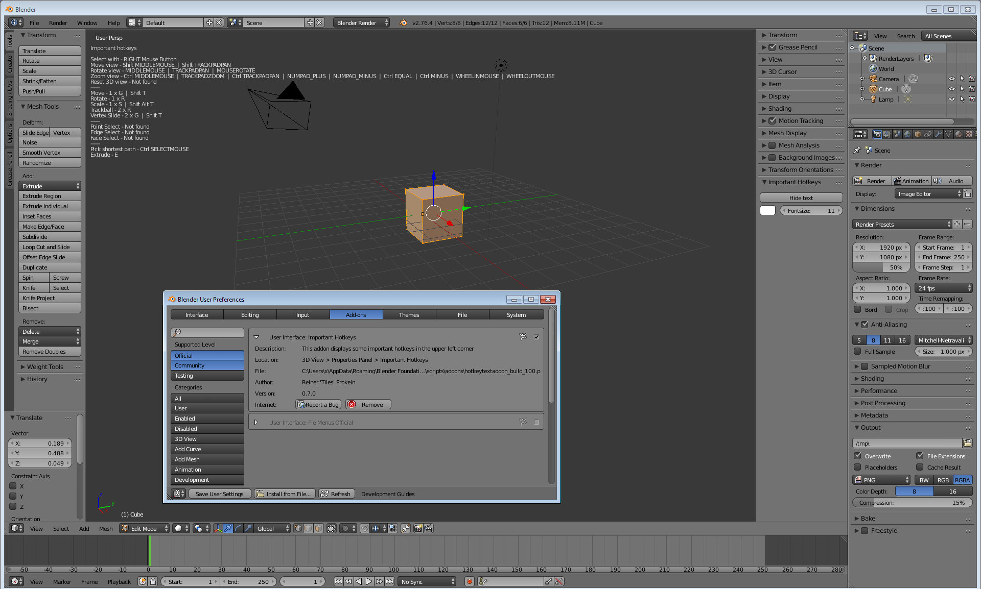 Important Hotkeys ist ein Addon das die wichtigsten Hotkeys in Textform oben links anzeigt. Es liest dafür die Hotkeynodes aus. Und zeigt den dafür verfügbaren Hotkey an. Oder auch mehrere sofern verfügbar. Das ist zum Beispiel beim Zoom der Fall. Da gibt es einige Hotkeys dafür.