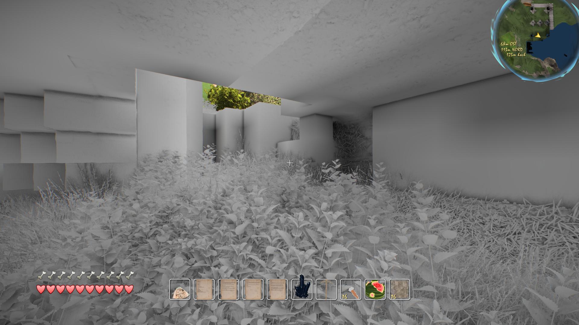 Grassfarbe bzw. ausblenden ist nur per shader. Vielleicht deswegen. Modelle können nur in der höchsten Landschaftslod existieren, bis jetzt. Deswegen sieht der Hintergrund so kahl aus. Außerdem sind da noch Bäume und Wurzeln, die blöderweise pro lod anderen seed haben. Auch wenn es nicht so aussieht aber durch die Lods müssten es schon weit über hundert objekte sein. Materialien sind es auch schon über hundert. Da ist das konsistent halten schon eine Herausforderung.