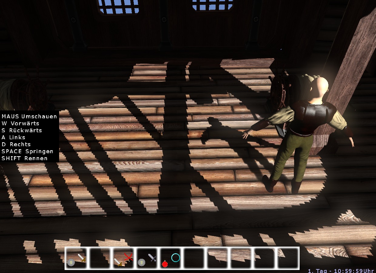 Also Exponential Shadow Mapping. Sieht auf den Bildern, die man im Netz dazu findet, wirklich gut aus. Aber nicht bei mir. Ich habe als Vergleich immernoch meine 32xPCF-Implementierung hier, die auch sauber gegen Selbstschattierung geschützt wurde. Aber ESM bleibt bei mir knochenhart, selbst mit 11x11 Box- oder Gauss-Weichzeichner auf der Shadow Map, logarithmisch oder linear. Es ist alles wurscht, ich kriege Penumbra Regions von bestenfalls einem Texel Breite. Folgende Bilder für maximale Aufmerksamkeitserhaschung: