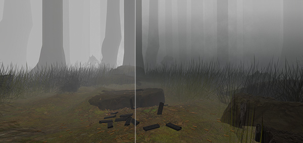 Die Nebelbilder sehen schon sehr stimmungsvoll aus. Ob dass dann in 3D cool ist... hm. Weiß nicht. Und die Landschaft wird auf Dauer etwas leer sein. Zum Glück kannst Du ja einen potenten PC voraussetzen, also knall da noch ein paar Layer Gras, totes Holz, Findlinge usw. rein.