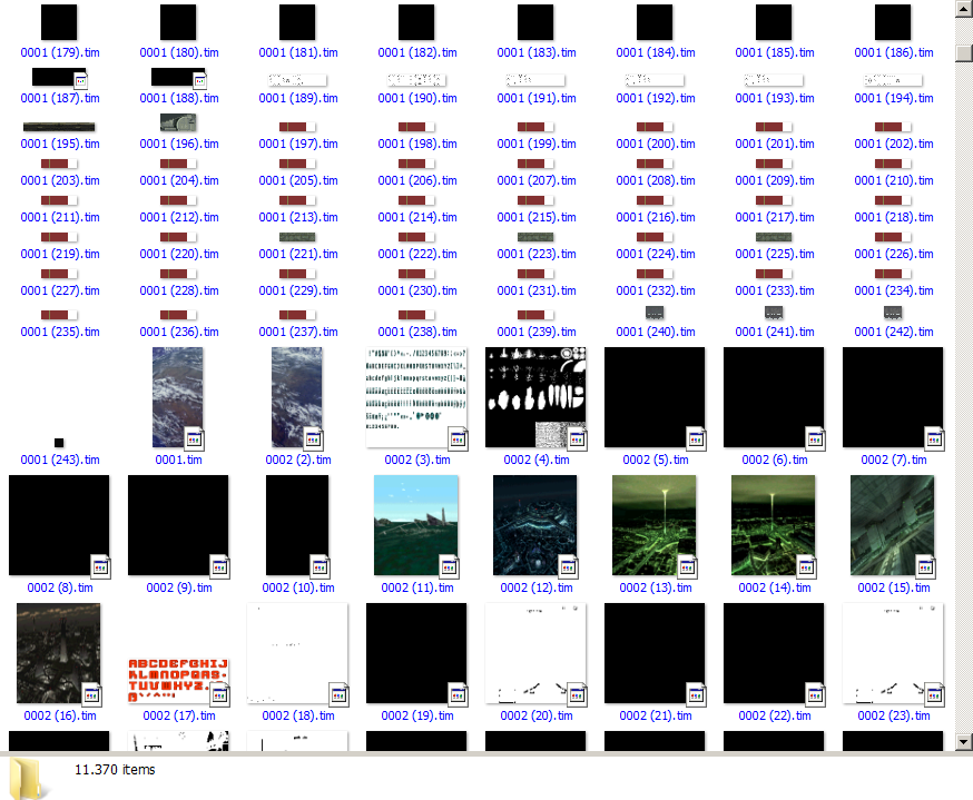 Also durchforsten wir einfach alle Archive nach der Magic Number 10 00 00 00. Das bewirkt natürlich viele False Positives, weil die Zahl in beliebigen Binärdaten nicht gerade selten auftaucht. Zum Glück habe ich aber meinen TIM-Loader zur Hand. Wenn 10 00 00 00 auftaucht, versucht der, die folgenden Bytes auf gut Glück als TIM zu lesen. Sobald ein Problem auftaucht, bricht er ab. Sonst kopiert er die Datei. Nach einigen Sekunden erhalten wir 13.141 Texturen: