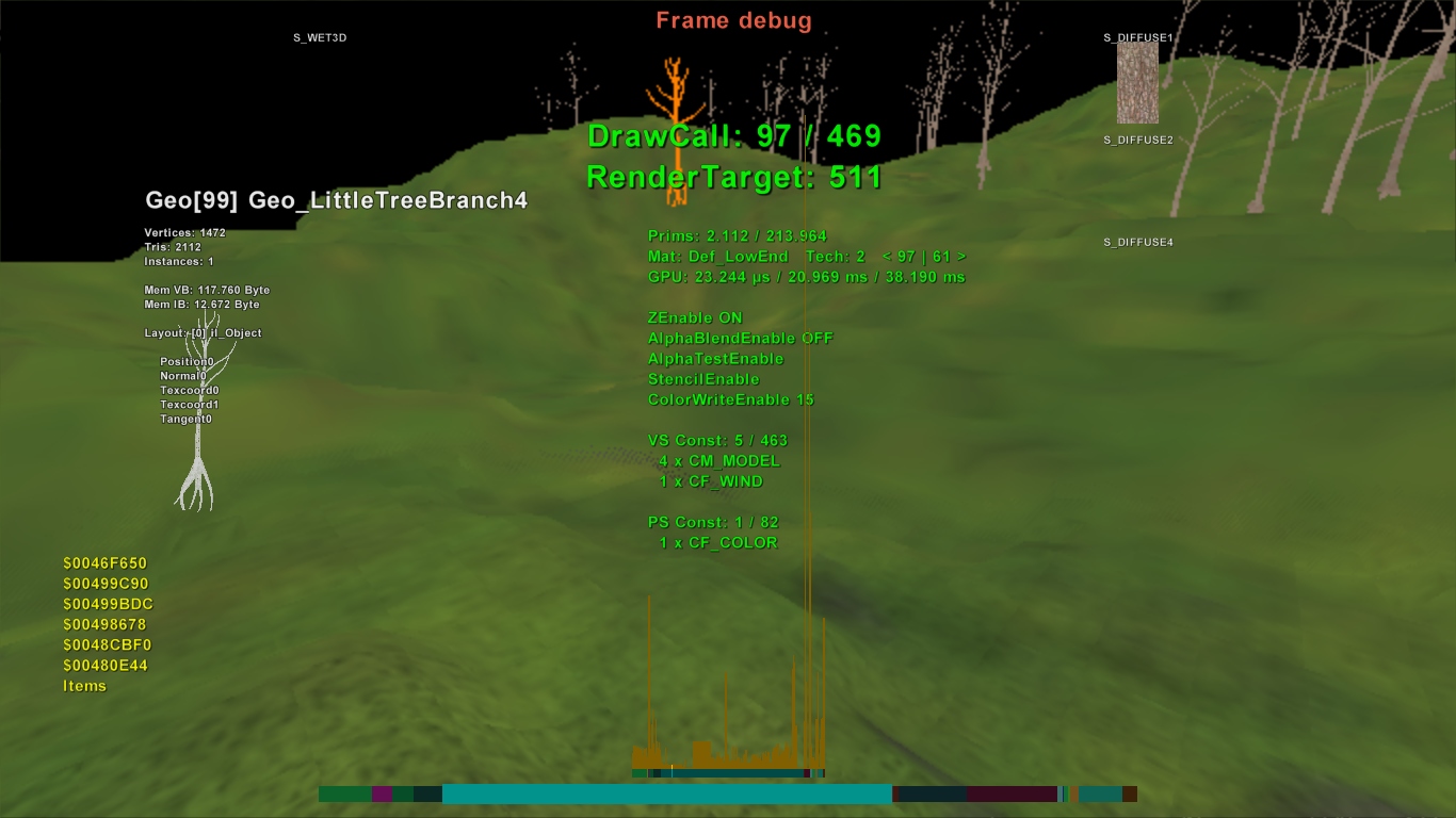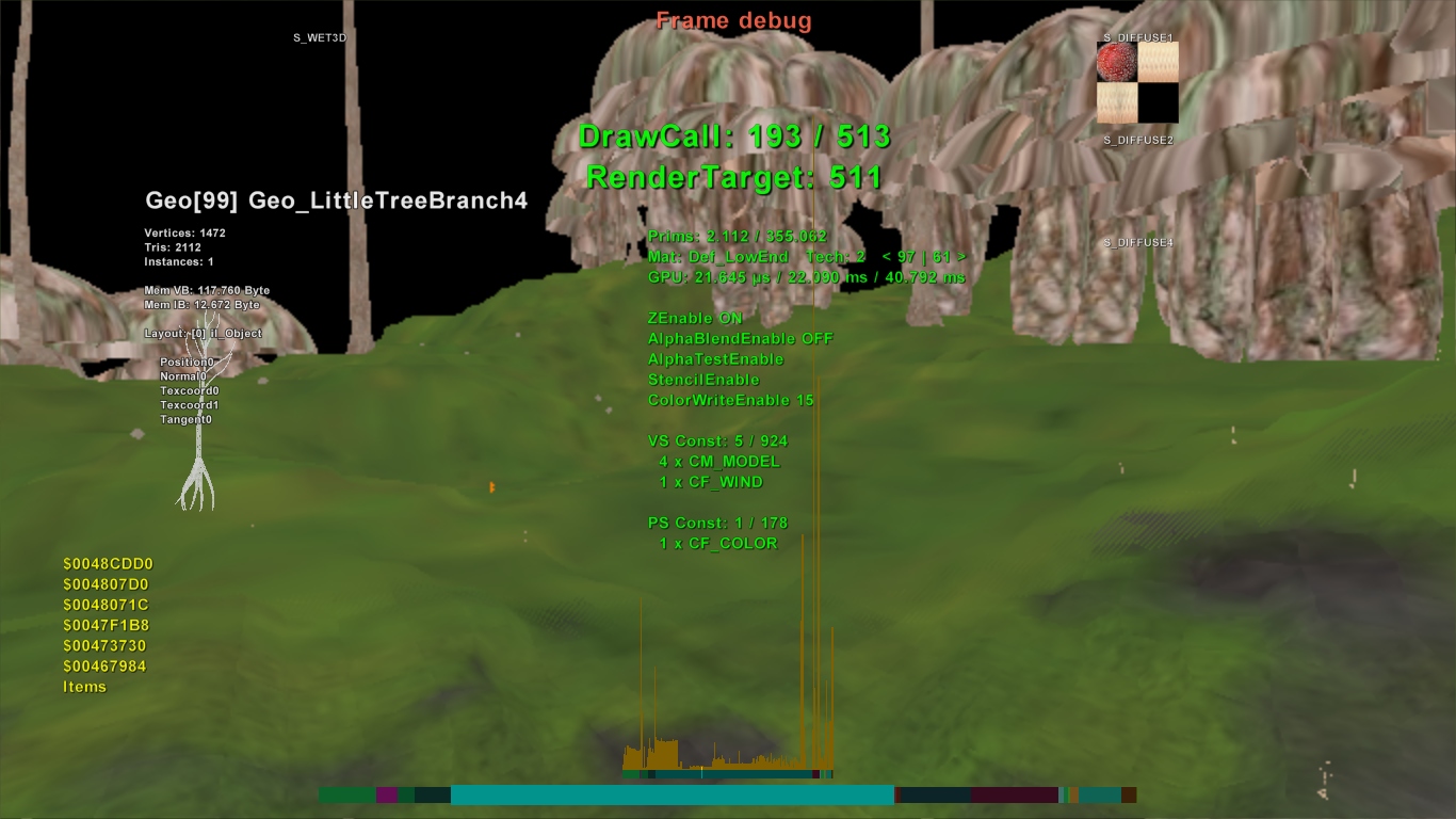 Es werden redundatente States gefiltert, bevor sie nach DX geschickt werden. Also zwischen den Drawcalls werden faktisch nur die Shaderkonstanten gesetzt, die auf den Bildern zu sehen sind, CF_... CM... usw.Krishty hat geschrieben:Setzt du auch die States vor jedem Pilz, und dabei vielleicht andere als für die Bäume?