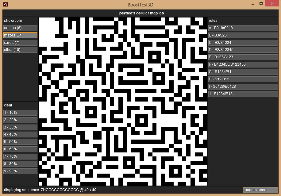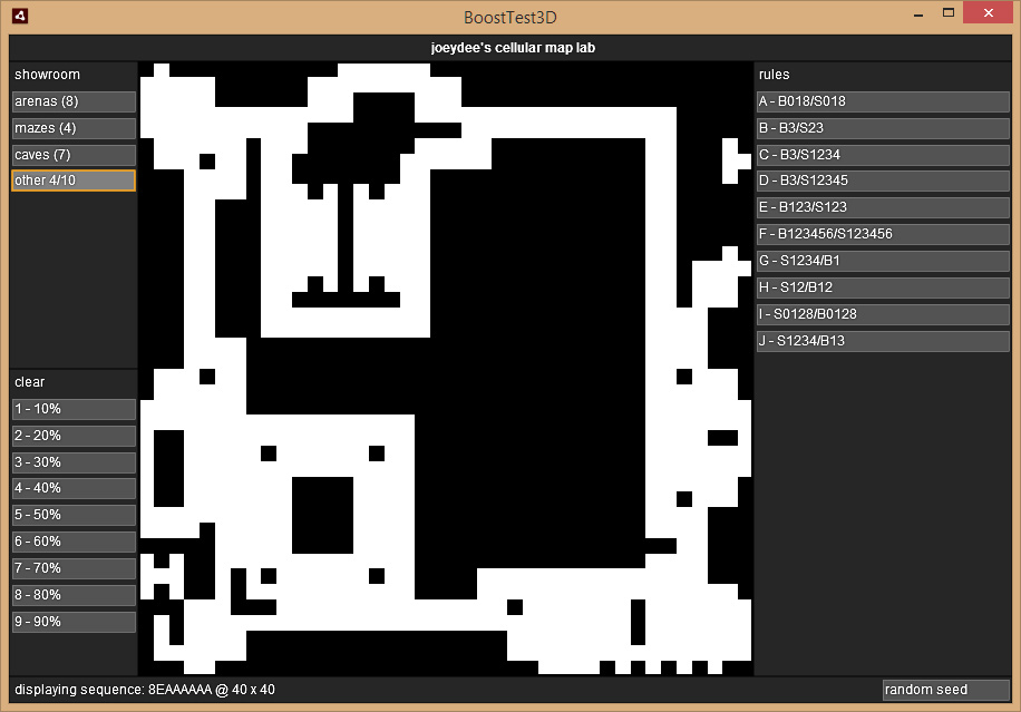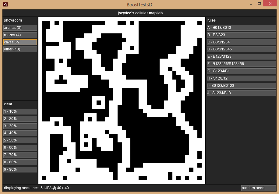 Die Regeln sind eher zufällig herausgepickt/ausprobiert. B ist z.B. das original Game of Life. Eigene Regeln kann man hier jetzt nicht eingeben. Wie die Regeln zu interpretieren sind, und wie der Automat funktioniert steht in der Wikipedia, von daher lässt sich das auch in 5 Minuten nachcoden. Ich halte das für ausbaubar, mit Bildfiltern, Masken, Fülloperationen, Analysewerkzeugen usw. und/oder einfach nur als Grundlage in einem Editor.