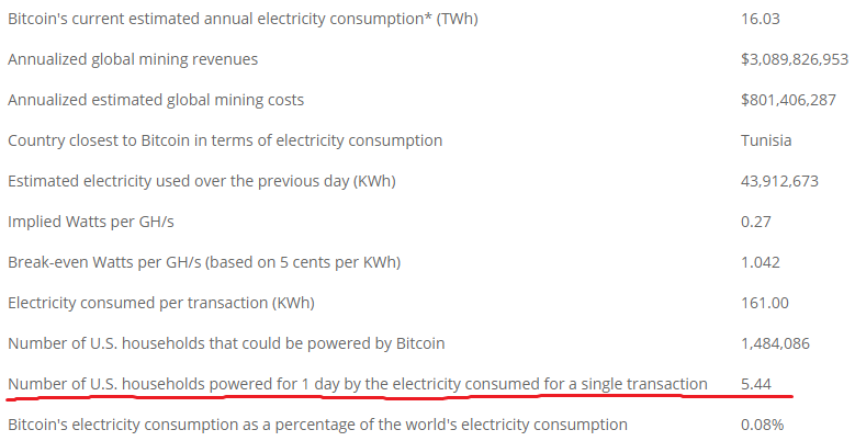 Ich habe das mal kurz nachgerechnet: Ein 3-Personen Haushalt ein Deutschland verbraucht pro Jahr ca. 3600 kWh, bei einem Strompreis von ca. 29 Cent pro kWh ergibt das einen Tagesverbrauch von ca. 2.68€, was Transaktionskosten von 15.5€ gleichkommen würde (wobei der Verbrauch in den Staaten anders sein kann (vermutlich höher, da ACs) und der Strompreis dort wo gemined wird niedriger sein dürfte).