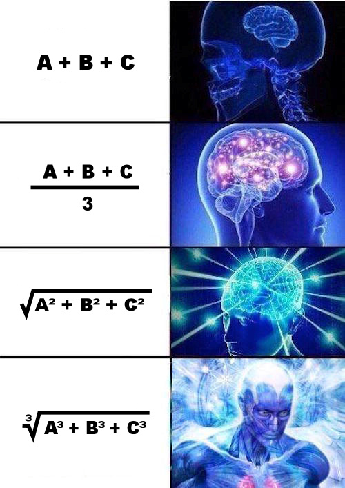 Aber die Schlussfolgerung, dass mit der Formel keine Übersteuerung auftritt ist verkehrt: wenn alles 1.0 ist, kommt da immer 3^(1/3) raus (>1). Davon abgesehen hat diese (x^3+y^3+z^3)^(1/3) Formel für Kompression komplett das falsche Verhalten. Kleine Werte werden kleiner, große Werte bleiben groß. Kompression funktioniert genau andersrum: Kleine Werte bleiben gleich, große Werte werden verkleinert umso größer die sind. Aber tanh kann man hier schreiben wie man will, diverse Leute haben die Welt ja schon verstanden