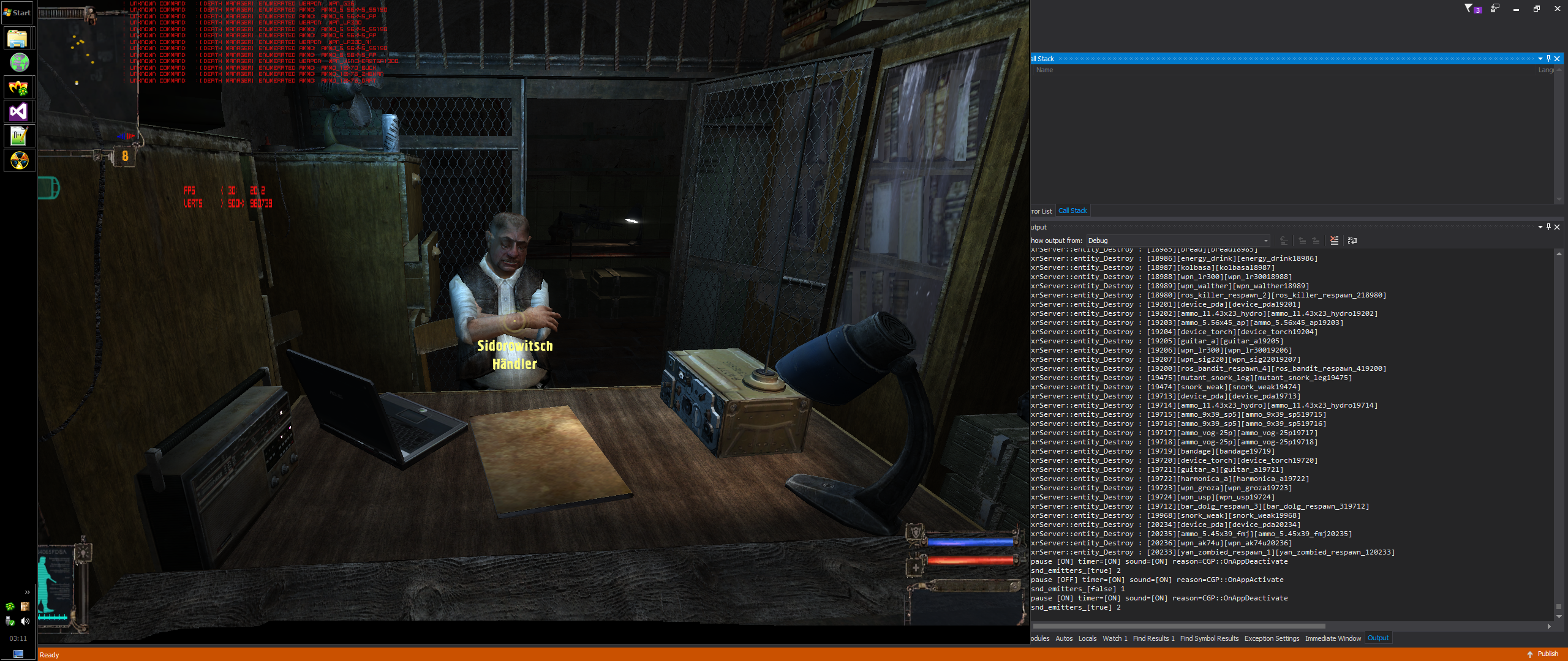 Ich habe also einfach den ganzen Quelltext von xrGame.dll in XR_3DA.exe gekippt. Das ging auch ohne große Probleme (zwei statt einem Precompiled Header, naja … und ein Bisschen die Initialisierungsreihenfolge aufgeräumt). Das Programm ist von 7 MiB auf 6.25 geschrumpft und hat nur noch einige hundert Exporte. Performance … keine Ahnung, habe nicht gemessen.