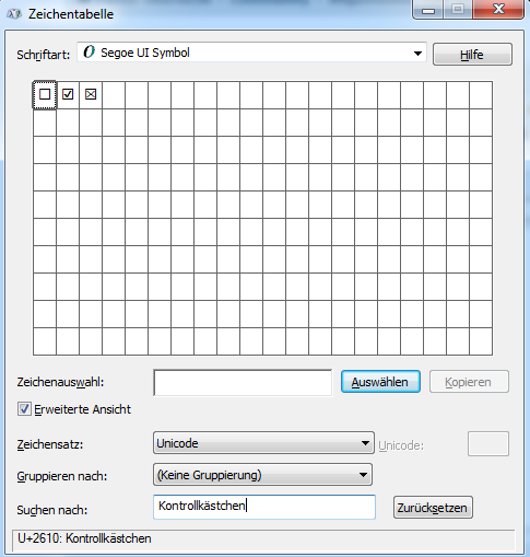 Das Programm zeigt für U+2610 "Kontrollkästchen" an. Auf unicode.org finde ich gerade nur die EN Bezeichnungen.