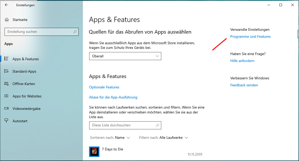 Wenn man im Startmenü auf Einstellungen geht landet man bei Apps & Features. Das Ding ist nicht wirklich toll. Oben links gibt es allerdings einen Link zu Programme und Features. Und da verbirgt sich die klassische Systemsteuerung wie man sie noch von Windows 7 kennt. Einfach oben in der Adressleiste zur Systemsteuerung navigieren.
