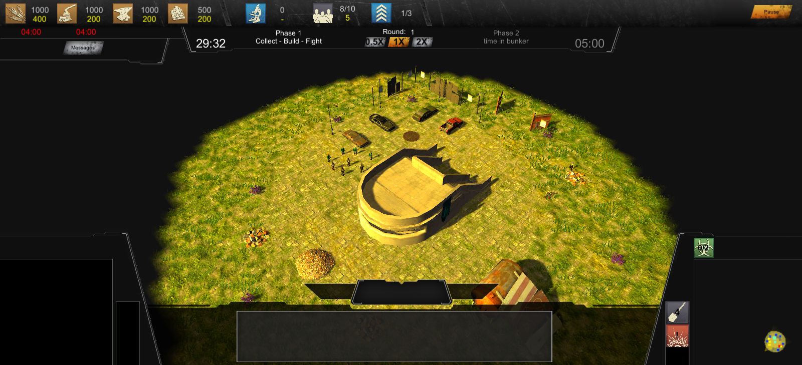 Mache ich jetzt auch (: Habe gerade noch eine Update 0.3.0.1 hoch geladen mit den ersten anpassungen:Ich würde vorschlagen den Fokus auf die erste Phase deiner Idee zu richten, d.h. was passiert vor der Bunkerzeit. Man muss halt 30min überleben und dann hat man Phase 1 gewonnen. Heisst aber Phase 1 muss in sich geschlossen gut funktionieren und irgendwie Spass machen, der Tech-Tree kann durchaus limitiert sein. Dann wird alles Zerstört und man kommt aus dem Bunker raus und Phase 2 beginnt. Mit sowas hättest du schon eine gute Demo und könntest gar über Kickstarter und ähnliches Zeug nachdenken (was ich auch hätte machen sollen, oder noch sollte).