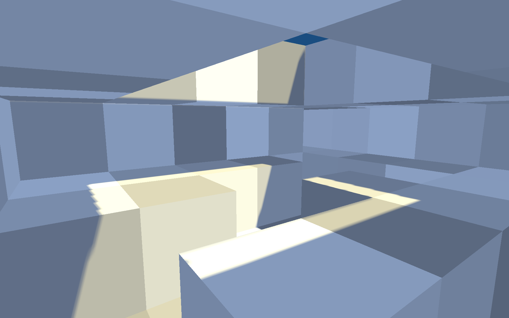 Ich hab für das Dungeon-Experiment eins meiner ZFXAction-Projekte verwurstet. Da gab's eine Sonne mit Schatten. Die wollte ich nicht verkommen lassen, aber für solche Geometrie, die Kante auf Kante sitzt und nach außen hin gar keine Flächen hat, war das sehr herausfordernd. Also habe ich deutlich mehr Zeit in die Rettung des Sonnenschattens gesteckt, als ich wollte. Das Kernelement, um zu verhindern, dass in den Kanten überall von oben Licht durchschimmert, ist ein 12-Texel-Randerweiterungs-Filter, den ich auf der 2048er ShadowMap ausführe. Ganz schön teurer Spaß. Aber dafür kann ich jetzt Deckenblöcke meines kleinen Dungeons entfernen und die Sonne reinscheinen lassen.