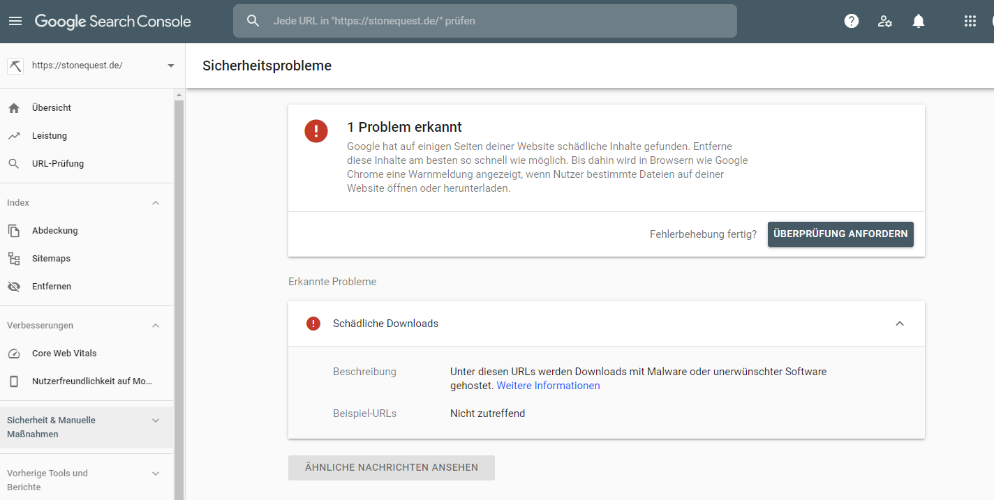 Also ich habe ja vor einer Woche etwa bei der "Google Search Console" mein "Sicherheitsproblem" als behoben eingereicht und wenig später wurde mir auch bestätigt, dass nun keine Sicherheitsprobleme mehr vorliegen. Der Download wurde weiterhin über Chrome geblockt. Bin ja davon ausgegangen, dass es dann vielleicht noch ein paar Tage dauert. Als ich nun heute vorsichtshalber nochmal nachgeschaut habe, wieder: