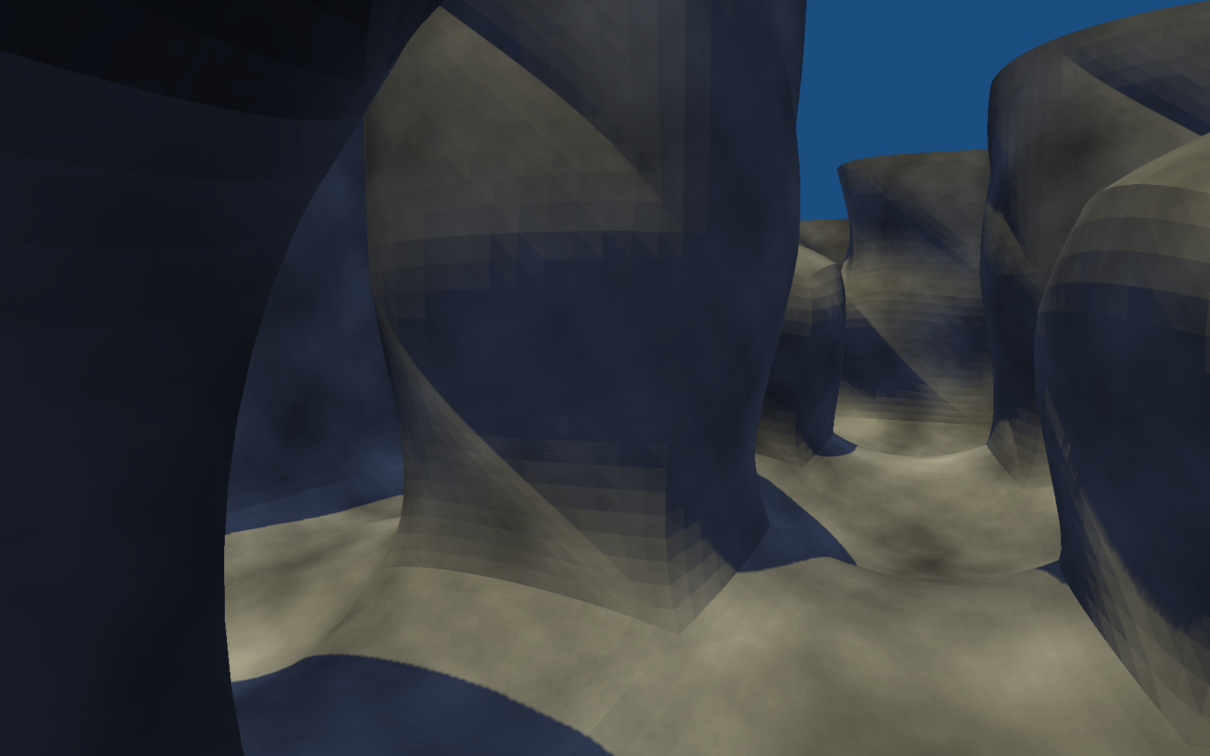 Damit bin ich jetzt theoretisch erstmal zukunftssicher, was verschiedene Detailgrade angeht. Leider gibt es noch zwei weitere Ursachen für Risse in den Wänden: a) mein Sand-"Shader" arbeitet nur lokal auf der Punktnormale, und die Normalen sind ja nicht stetisch über Segment-Kanten hinweg. Und b) irgendne kleine Ungenauigkeit beim Auslenken der Vertizes, wodurch Haarrisse an den Segmentkanten entstehen. Die muss ich beide noch beseitigen, bevor ich mit echtem Content weitermachen kann.