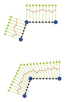 Normalen des Ursprungsmeshes: oberes Bild, grün. Wenn man jetzt das Mesh in kleinere Faces (schwarze Punkte) unterteilt und per Noise-Wert die neuen Punkte entlang der Flächennormalen verschiebt (rot=neue Oberfläche), entstehen hässliche Verzerrungen an den Ecken und Kanten.