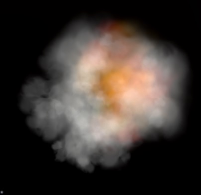 Zum Schluss ist die Rauchwolke welches am Anfang ach hell ist und am besten etwas rötlich oder orange. Diese Farbe sollte sich im laufe der Explosion in ein dunkles (bei hellem Hintergrund) oder graues Rauch verwandeln und am besten über Alpha den Rauch langsam ausblenden lassen.