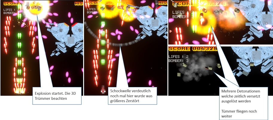 Jetzt kommt der Moment. Die Explosion ist ins Spiel integriert worden. Der erste Gegner fliegt auf mich zu. Ich schieße...Buuummmmmm