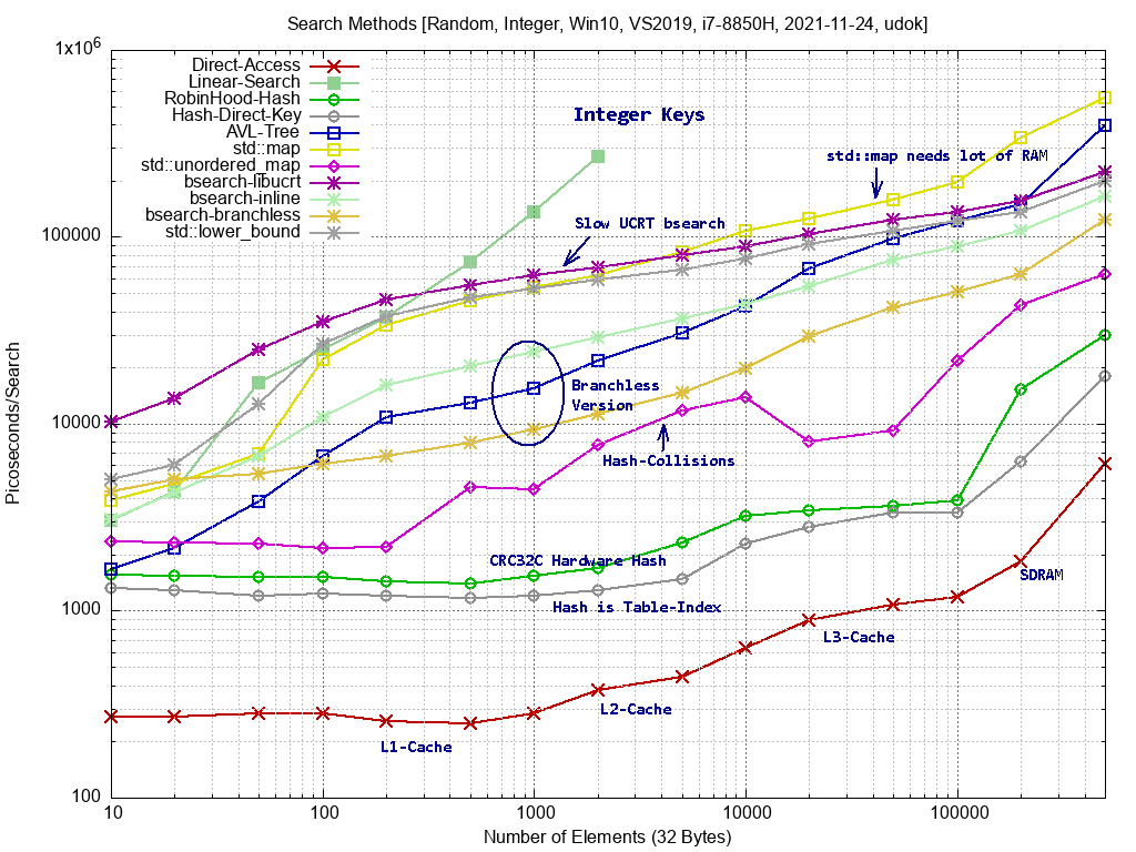 Auf der dirtyhandscoding Seite sind die Ergebnisse aber deutlich langsamer als meine Werte für die Hash Suche (ca 10 ns zu 1.5 ns @ 64 Elemente).
