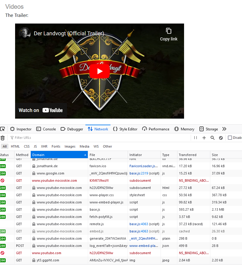 Ich denke, das Problem liegt NoScript. Denn es wird auch https://jonathank.de/games/js/dsgvo-video-embed.js lokal eingebunden, was eben dafür sorgt, dass beim Seitenaufruf das Laden vom Youtube Server verhindert wird.