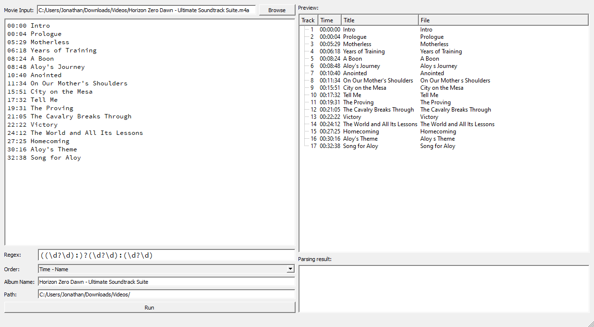 Klickt man jetzt auf "Run" hat man im Ausgabeordner einzelne mp3-Dateien inklusive Tags (Album Name, Track Nummer, Track Name). Die Dateien sind sinnvoll benannt, Sonderzeichen etc. werden entfernt.