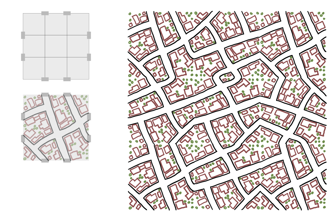 Hier mit nur einer einzigen handgezeichneten Dorf-Kachel, allein das gibt schon ziemlich Vielfalt im Straßenlayout. Funktioniert natürlich auch für regelmäßigere Layouts, wo z.B. eine große Kachel aus n*n Tiles mit einem üblichen Dungeon-Tileset vorgestaltet ist.