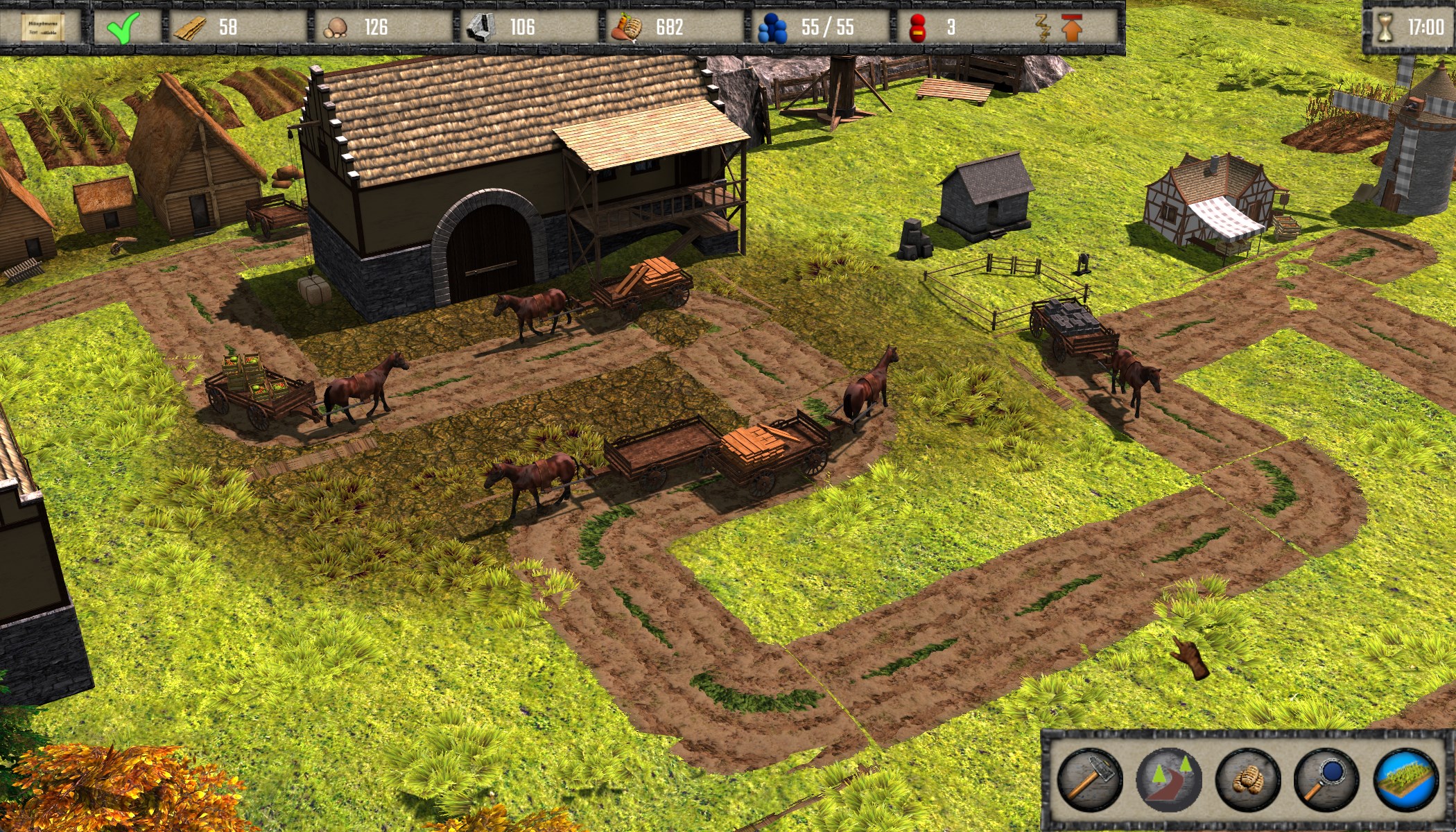 Jonathan hat geschrieben: 27.07.2021, 16:33 Ein Screenshot vom aktuellen Stand. Man sieht eine Siedlung mit ~150 Einwohnern, diverse Betriebe, öffentliche Gebäude und viele fleißige Pferdefuhrwerke, die all die Waren transportieren. Neu sind unter anderem die Wassermühle und Fischerhütten, man muss also endlich die Flüsse ganz konkret in die Stadtplanung einbeziehen und sie sind nicht länger bloß Hindernisse, die man umbauen muss.